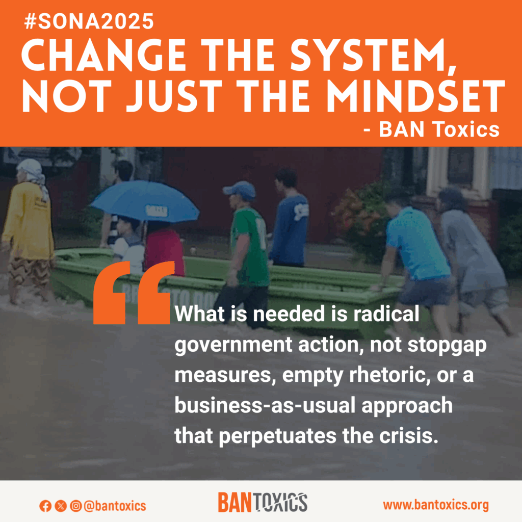 In a recent government briefing following the torrential rains and widespread flooding, President Marcos Jr. remarked that “we just have to change the way we think.” In response, BAN Toxics emphasized that what is needed is not only a change in mindset but a change in the system itself. The group pointed out that there are clear, concrete, and achievable solutions to address what the president referred to as “the new normal.”
