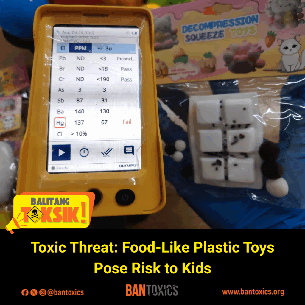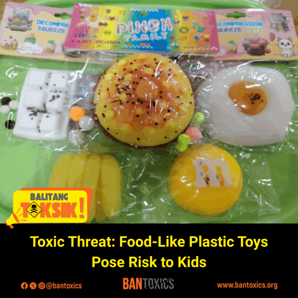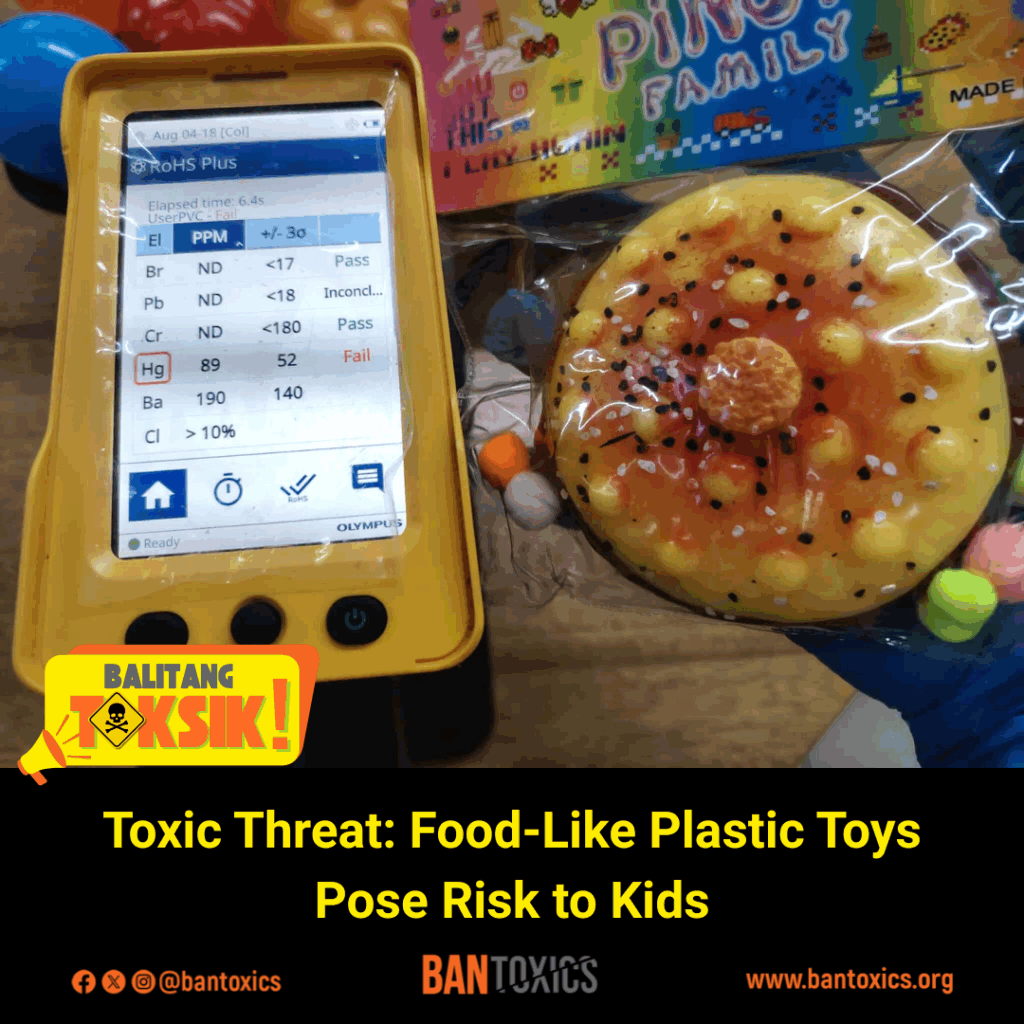 BAN Toxics further urges local government units and the Food and Drug Administration to conduct post-marketing surveillance and issue a public health advisory against food-like plastic toys to prevent toxic exposure among children.