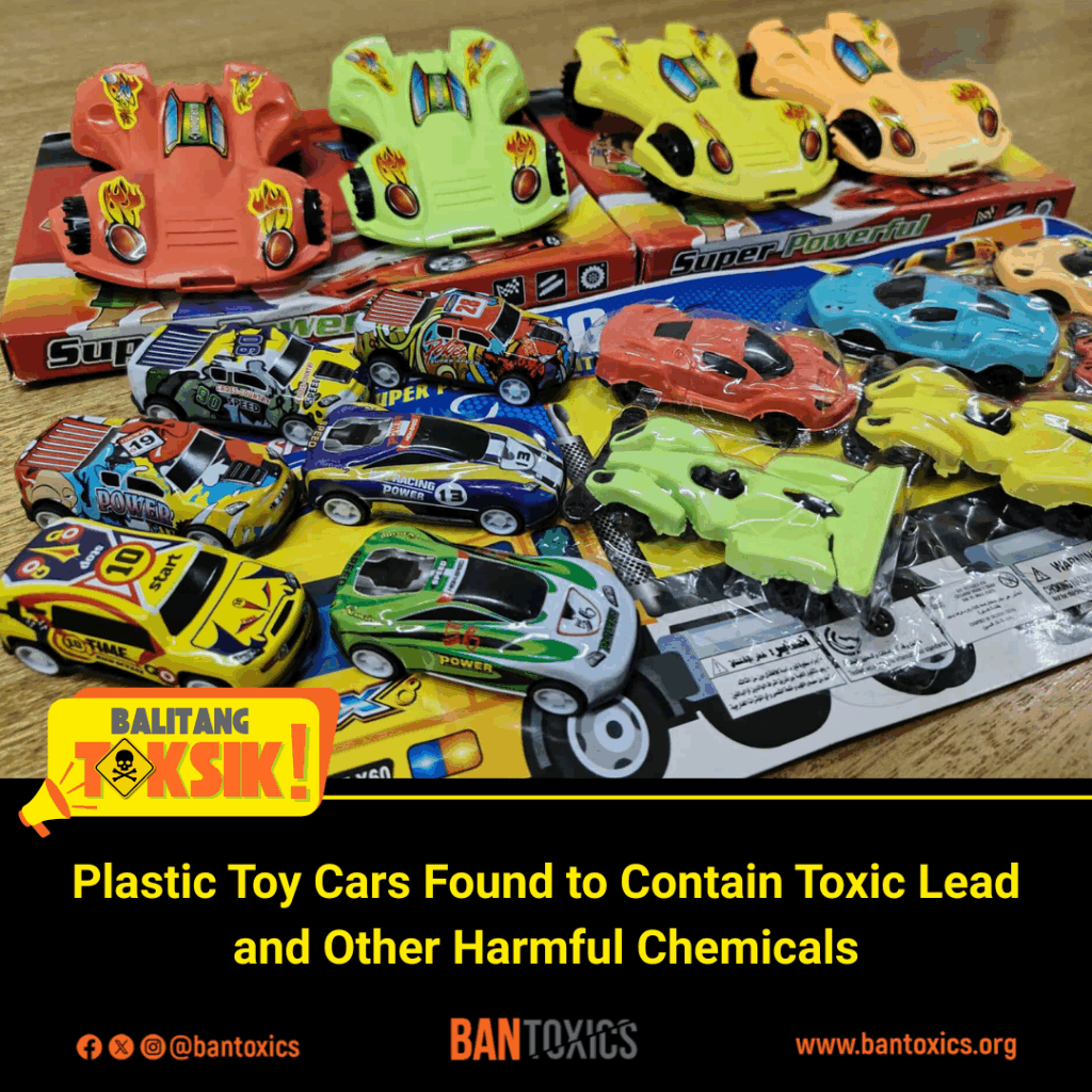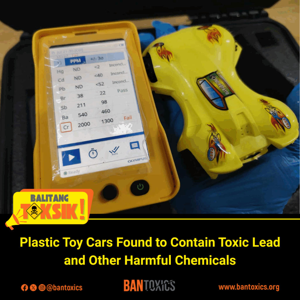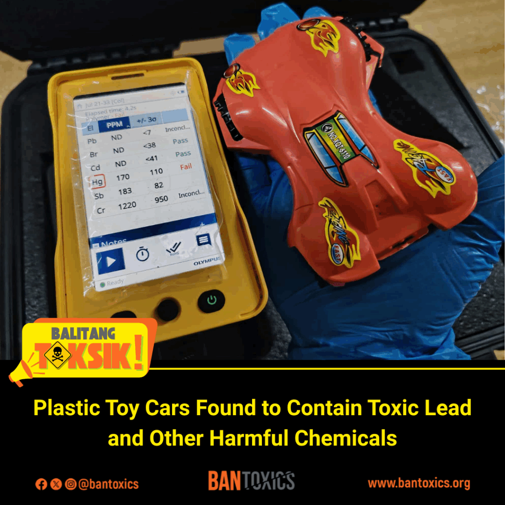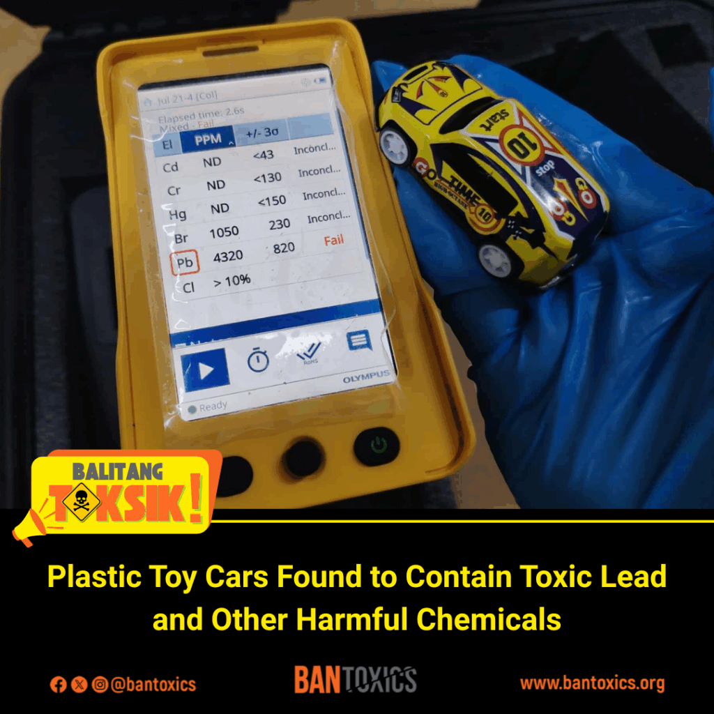 Toxics watchdog BAN Toxics raised the red flag after finding lead in various toy cars sold in major public markets in Metro Manila. Using a Vanta C Series XRF Chemical Analyzer, the group screened 15 toy samples, all of which were found to contain lead at levels ranging from 790 parts per million (ppm) to as high as 4,320 ppm. Chromium and mercury were also detected.