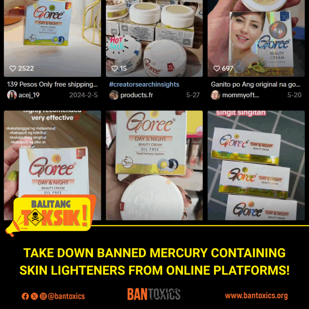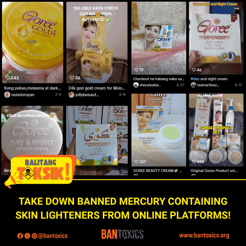 “The illegal trading of mercury-added SLPs online is a direct violation of RA 11967, or the Internet Transactions Act,” said Thony Dizon, Advocacy and Campaign Officer of BAN Toxics. “A takedown order should be issued to remove the ads, postings, and listings of prohibited whitening products to protect consumers from toxic mercury exposure.”