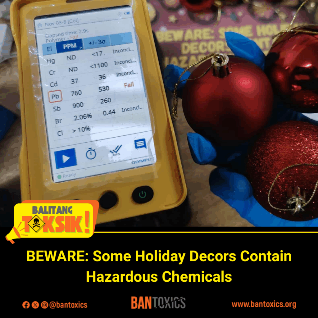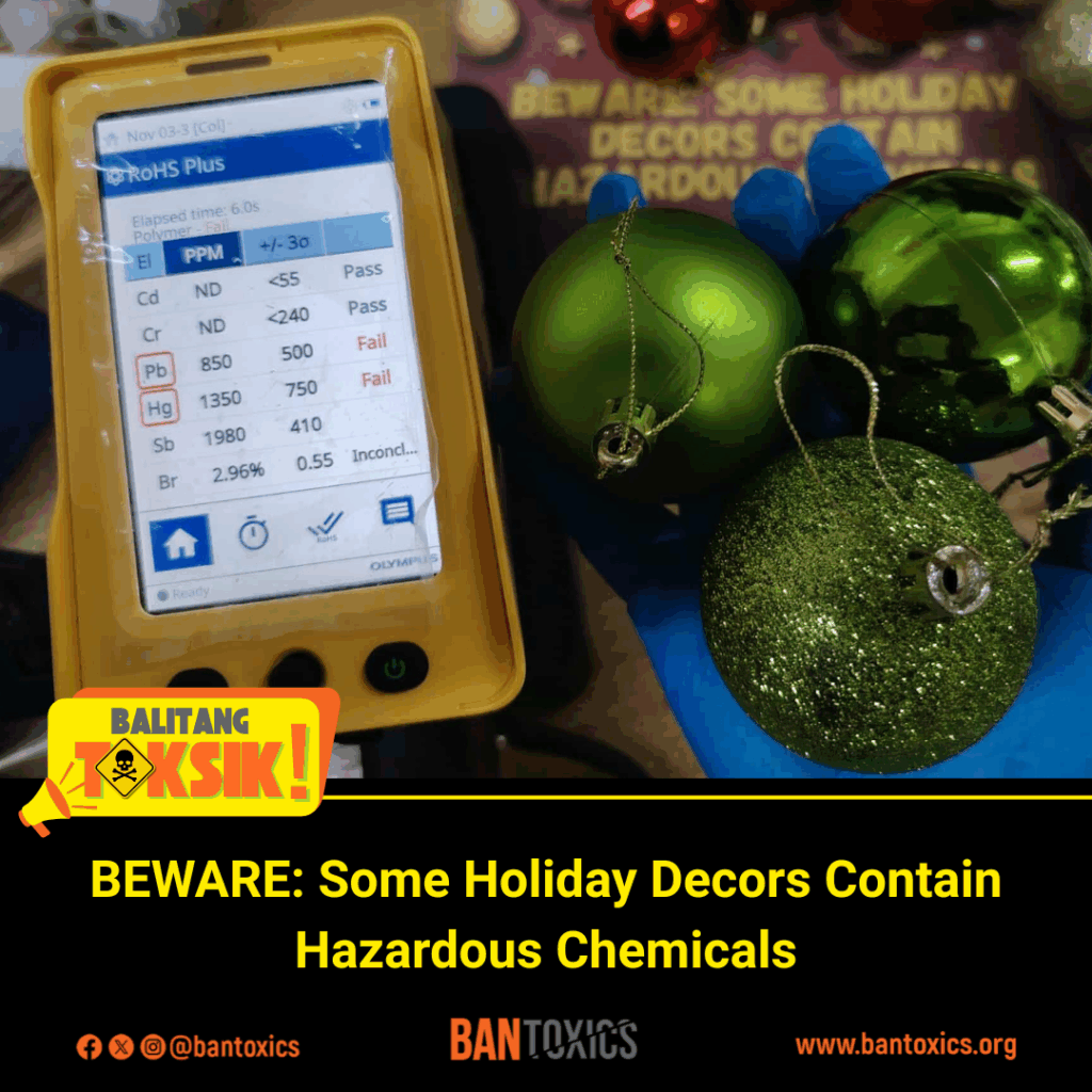 “Holiday decorations should undergo product testing for restricted hazardous substances before they are sold in the market, ” said Thony Dizon, Advocacy and Campaign Officer of BAN Toxics. The presence of toxic chemicals such as lead, mercury and cadmium may pose health risks to the public, especially among children.”