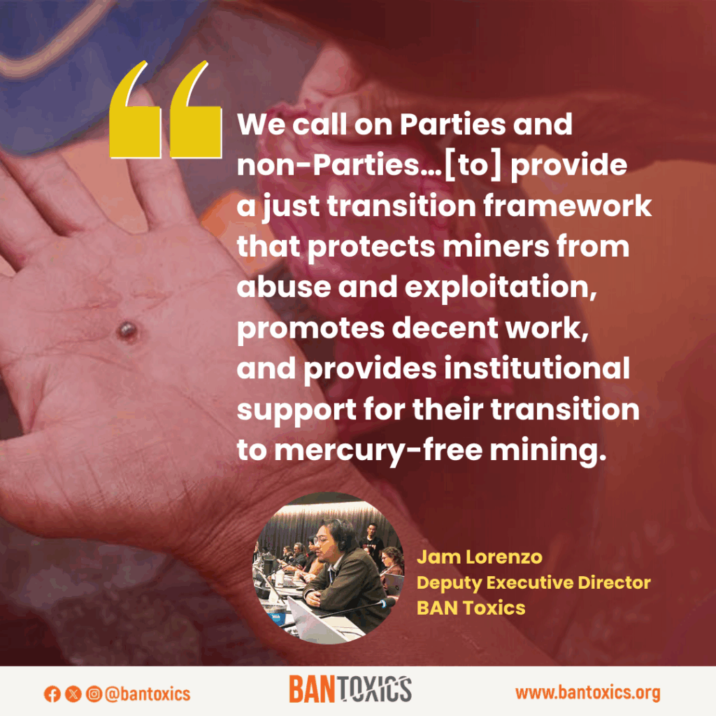 The statement, delivered by BAN Toxics’ Deputy Executive Director Jam Lorenzo on behalf of the coalition, called on both parties and non-parties [2] to the Convention to take stronger steps toward compliance. The coalition urged countries that have yet to do so to submit their National Action Plans (NAPs)[3] on ASGM, and reminded those that have already submitted to provide updates and reviews on their implementation progress.