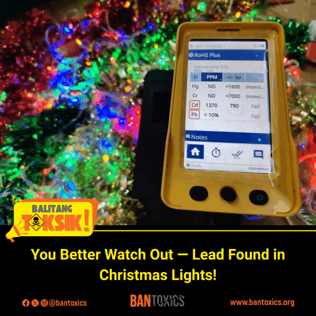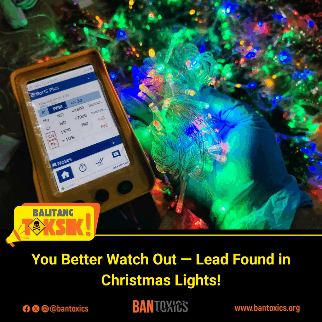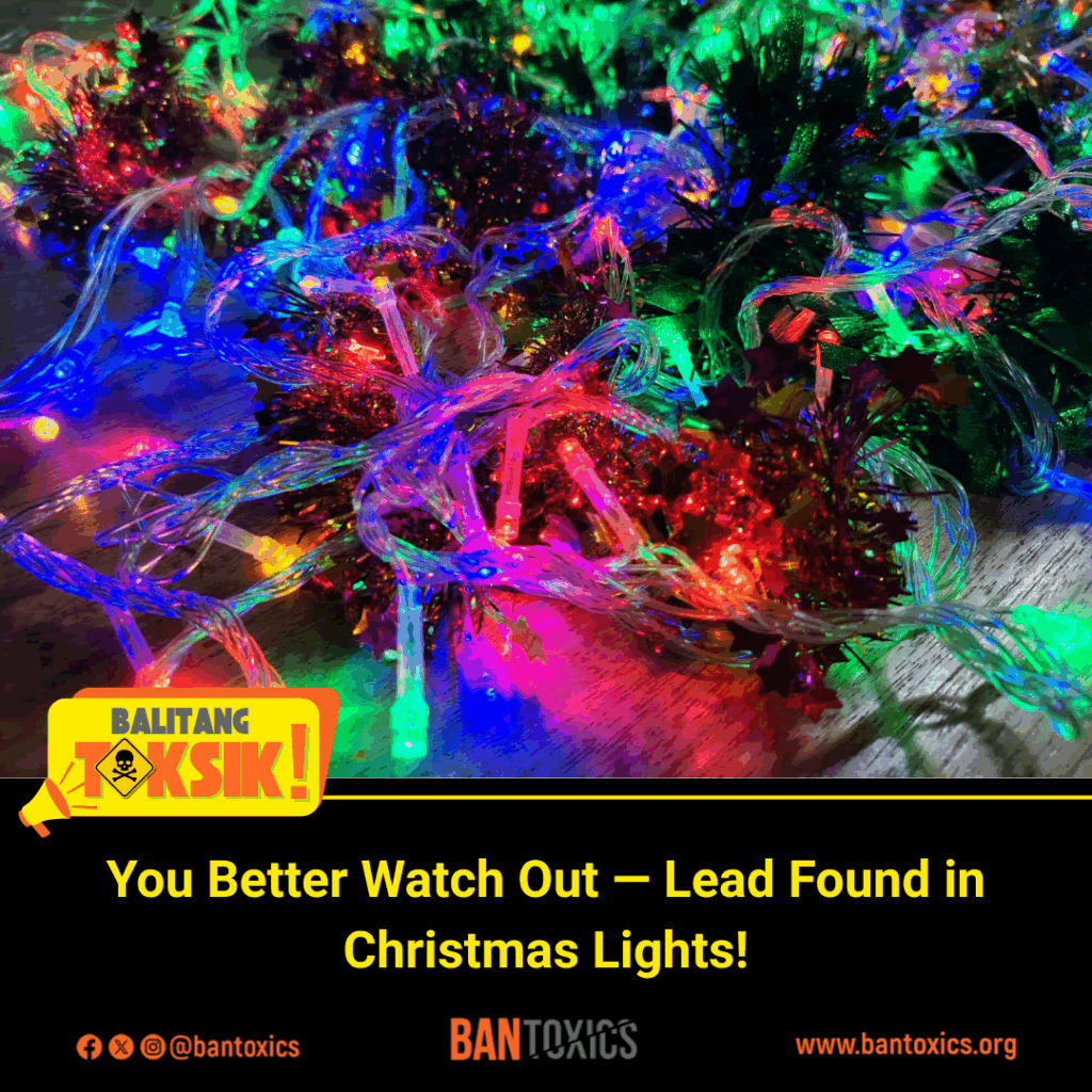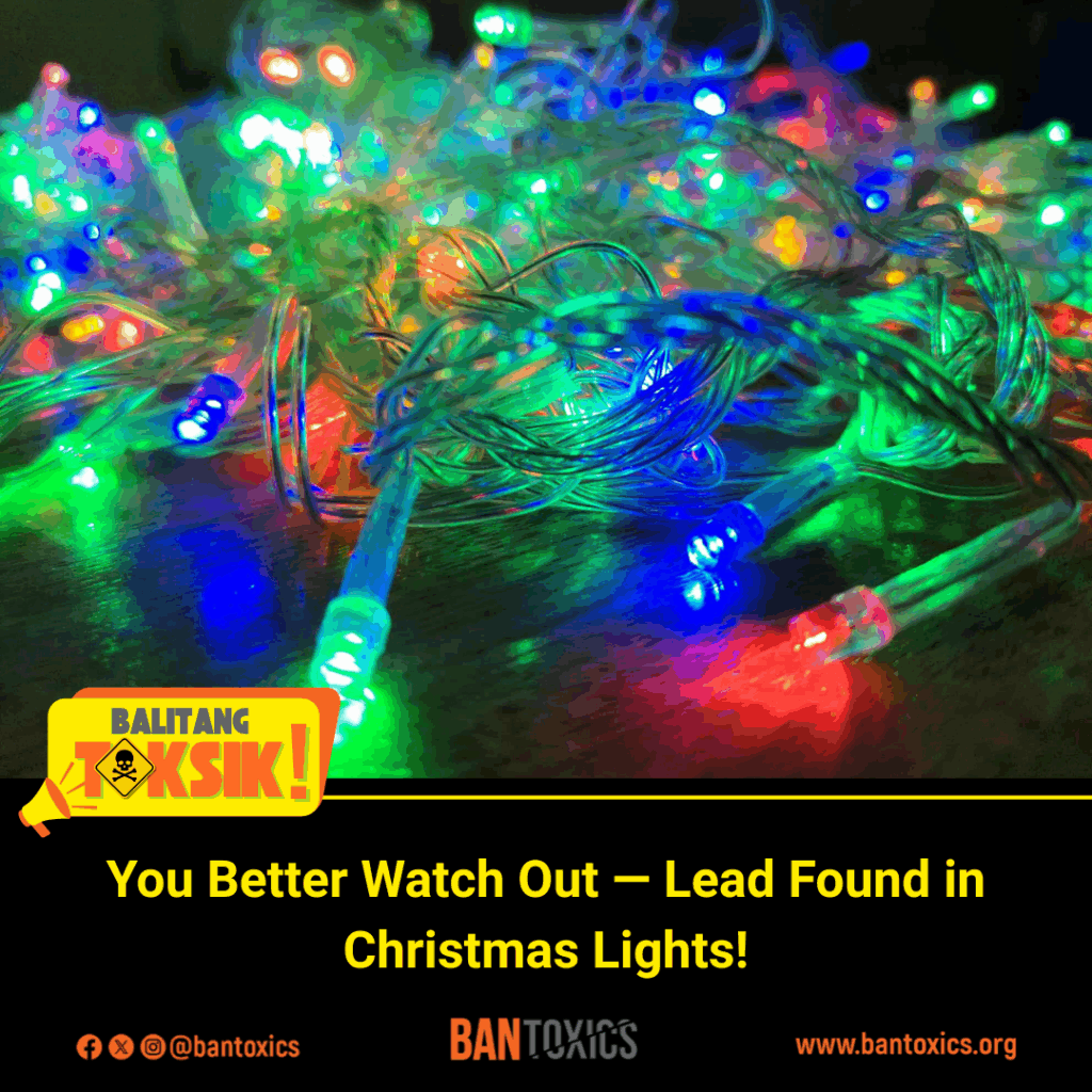 “We call the attention of the Department of Trade and Industry (DTI) to conduct market surveillance and verify if the Christmas lights being sold in the market comply with the Philippine National Standards (PNS), and to consider adopting regulations similar to the EU’s RoHS Directive to limit hazardous substances in electrical products,” said Thony Dizon, Advocacy and Campaign Officer of BAN Toxics.